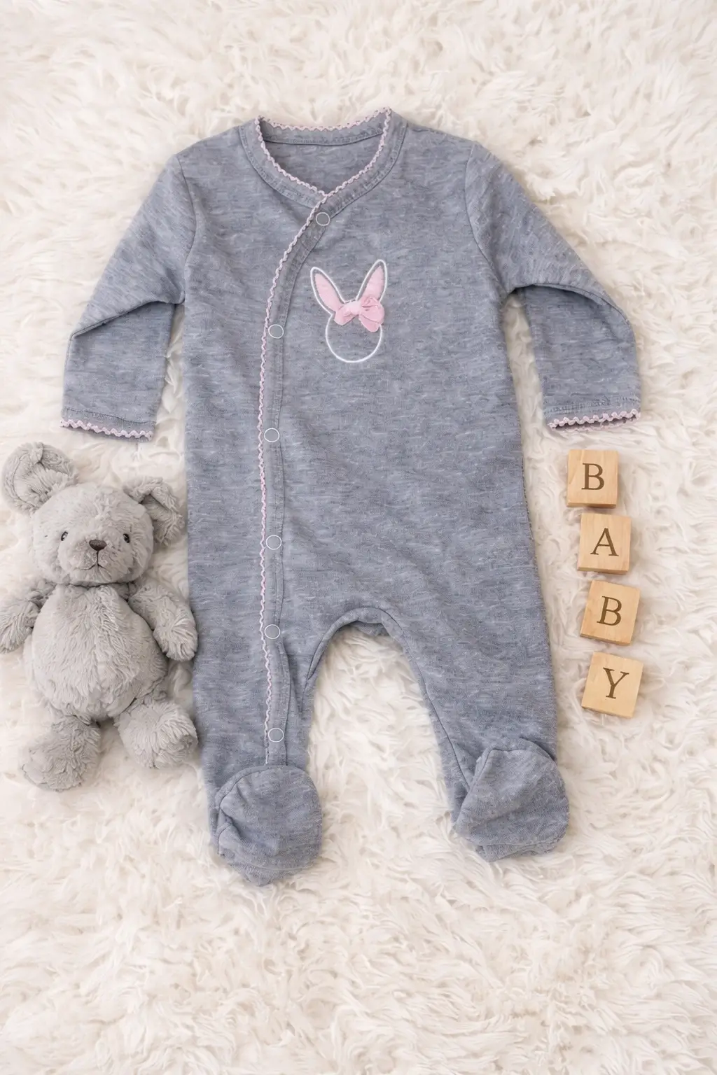 Sevimli tavşan nakış detayıyla tasarlanan bu 4’lü set, günlük kullanımda ve özel anlarda bebeğinize tatlı bir görünüm kazandırır.